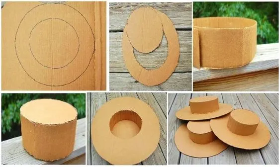 Najpierw wytnij z kartonu koło o średnicy około 40 cm. Ze środka wytnij kolejne koło i średnicy około 10 cm. Z tektury falistej wykonaj rulon o odpowiedniej średnicy. Sklej tekturę na gorącą, a następnie stwórz kilka ozdób, dzięki którym kapelusz będzie się prezentował jeszcze bardziej oryginalnie.